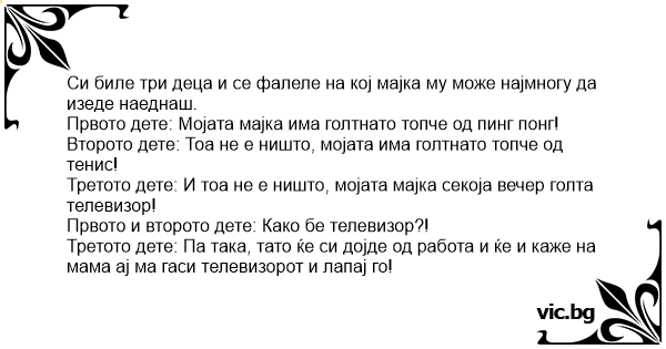 Третото дете: Па така, тато ќе си дојде од работа и ќе и каже на мама ај ма гаси телевизорот и лапај го!