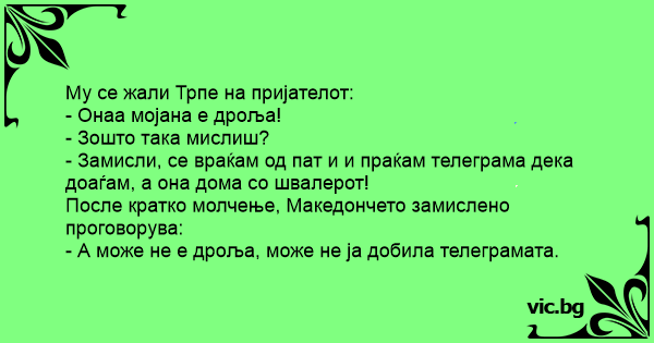 - Замисли, се враќам од пат и и праќам телеграма дека доаѓам, а она дома со швалерот!