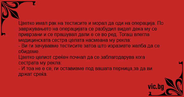 Цветко имал рак на тестисите и морал да оди на операција. По завржувањето на операцијата се разбудил видел дека му се приврзани и се прашувал дали е се во ред. Тогаш влегла медицинската сестра целата насмеана му рекла: