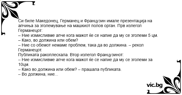 Си биле Македонец, Германец и Французин имале презентација на апчиња за зголемување на машкиот полов орган. Прв излегол Германецот:
