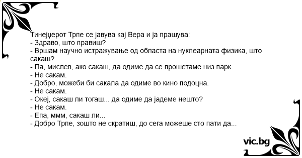- Добро Трпе, зошто не скратиш, до сега можеше сто пати да ме викнеш кај тебе и да имаме