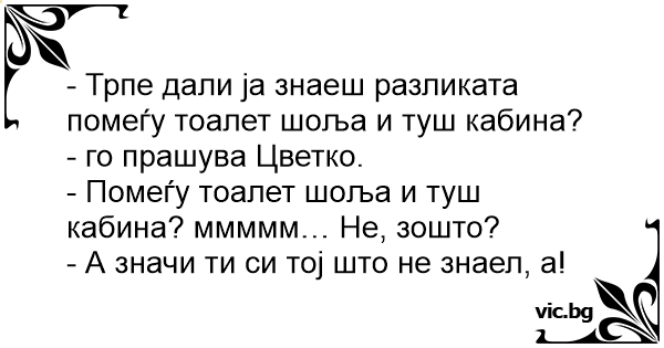 - Трпе дали ја знаеш разликата помеѓу тоалет шоља и туш кабина? - го прашува Цветко.