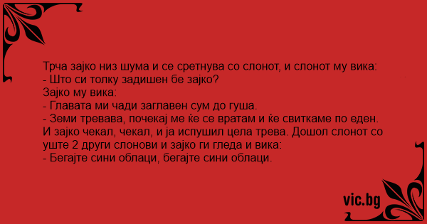Трча зајко низ шума и се сретнува со слонот, и слонот му вика: