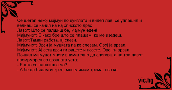 Мајмунот: Врзи ја муцката па ќе слезам. Овој ја врзал.