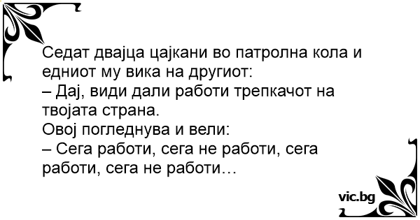 Седат двајца цајкани во патролна кола и едниот му вика на другиот: