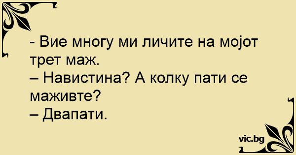 Vakarėlio metu moteris sako savo kaimynui iš dešinės: - Jūs labai panašus į mano trečiąjį vyrą. - O kiek vyrų jūs turėjote? - Du.