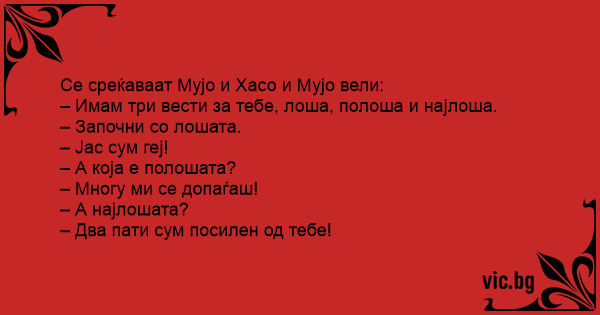 Се среќаваат Мујо и Хасо и Мујо вели: