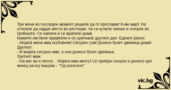 - На вас ви е лесно... Мојата има многу! Се прибра сношти и донесе цел венец на кој пишува – "Од колегите"