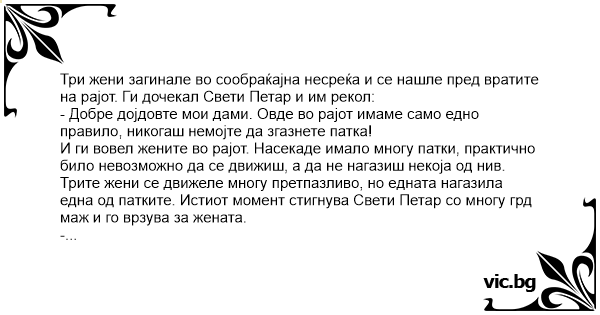 Три жени загинале во сообраќајна несреќа и се нашле пред вратите на рајот. Ги дочекал Свети Петар и им рекол: