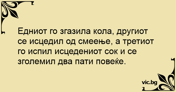 Eдниот го згазила кола, другиот се исцедил од смеење, а третиот го испил исцедениот сок и се зголемил два пати повеќе.
