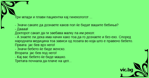 - Значи сакате да дознаете каков пол ќе бидат вашите бебиња? - Даааа! Докторот сакал да ги заебава малку па им рекол: - А знаете ли дека има начин како тоа да го дознаете и без ехо. Според народната медицина тоа зависи од позата во која што е правено бебето. Првата: јас бев врз него! - Значи бебето ќе биде женско. Втората: јас бев под него! - Кај вас бебето ќе биде машко. Третата почнала да плаче на цел глас. - Што се случило?? Зашто плачете - ја прашал докторот. - Моето ќе биде кученце...