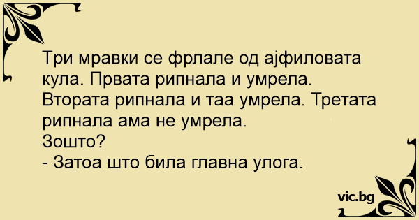 Tри мравки се фрлале од ајфиловата кула. Првата рипнала и умрела. Втората рипнала и таа умрела. Третата рипнала ама не умрела.
