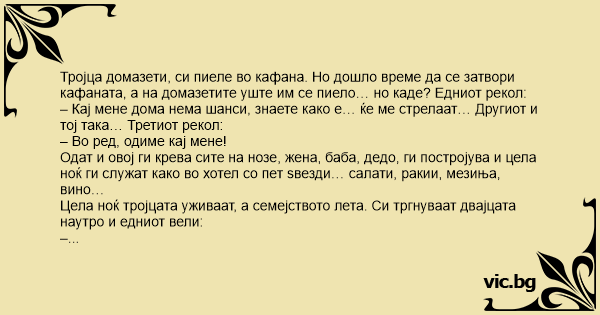 – Па… како да ти кажам… Кога влегов прв пат во оваа куќа, едно куче ми залаја… извадив и му дадов жолт картон. Наредниот ден, пак ми залаја… му извадив втор жолт картон, трет пат ми залаја… му извадив црвен картон, ја извадив пушката и го застрелав!