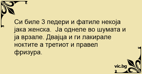 Си биле 3 педери и фатиле некоја јака женска. Ја однеле во шумата и ја врзале. Двајца и ги лакирале ноктите а третиот и правел фризура.
