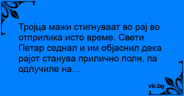 Тројца мажи стигнуваат во рај во отприлика исто време. Свети Петар седнал и им објаснил дека рајот станува прилично полн, па одлучиле на...