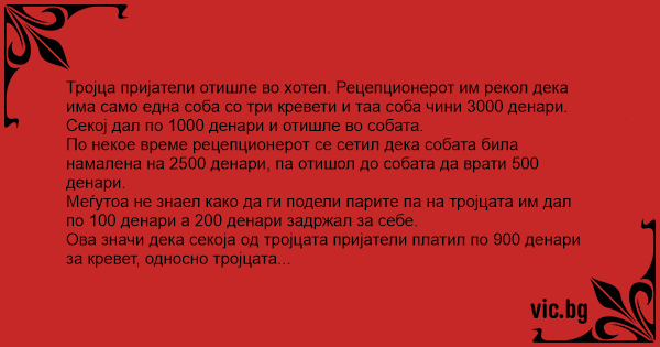 Тројца пријатели отишле во хотел. Рецепционерот им рекол дека има само една соба со три кревети и таа соба чини 3000 денари.