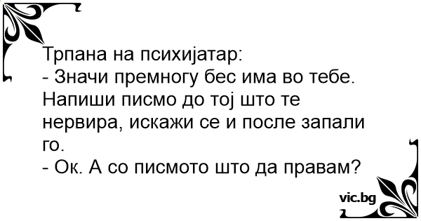 - Значи премногу бес има во тебе. Напиши писмо до тој што те нервира, искажи се и после запали го.