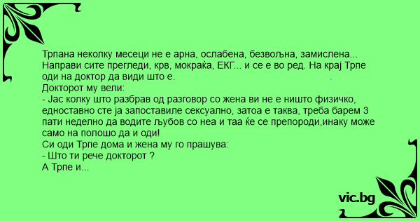 - Јас колку што разбрав од разговор со жена ви не е ништо физичко, едноставно сте ја запоставиле сексуално, затоа е таква, треба барем 3 пати неделно да водите љубов со неа и таа ќе се препороди,инаку може само на полошо да и оди!
