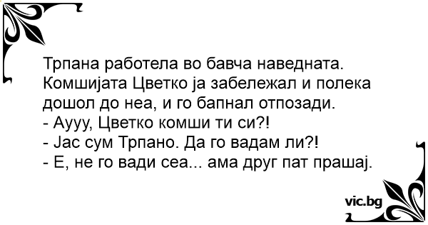 Трпана работела во бавча наведната. Комшијата Цветко ја забележал и полека дошол до неа, и го бапнал отпозади.