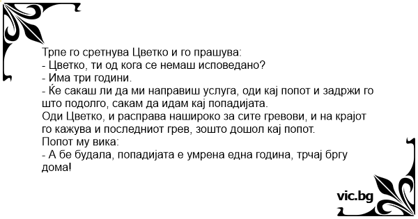- Цветко, ти од кога се немаш исповедано?