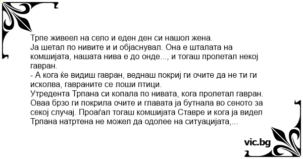 Утредента Трпана си копала по нивата, кога пролетал гавран. Оваа брзо ги покрила очите и главата ја бутнала во сеното за секој случај. Проаѓал тогаш комшијата Ставре и кога ја видел Трпана натртена не можел да одолее на ситуацијата, и и го бутнал.