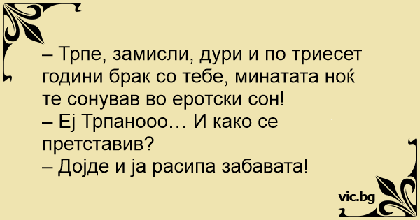 – Трпе, замисли, дури и по триесет години брак со тебе, минатата ноќ те сонував во еротски сон!