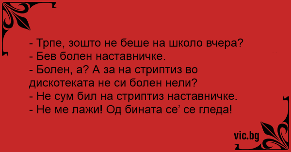 - Болен, а? А за на стриптиз во дискотеката не си болен нели?
