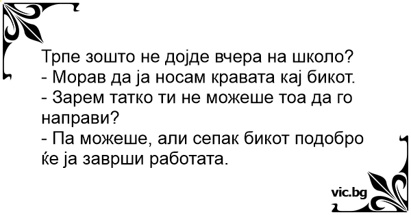 Сільська школа: — Петре! Ти чому вчора в школі не був? — Та ми з батьком корову до бика водили. — А що, батько сам не міг? — Та міг, але бик краще.