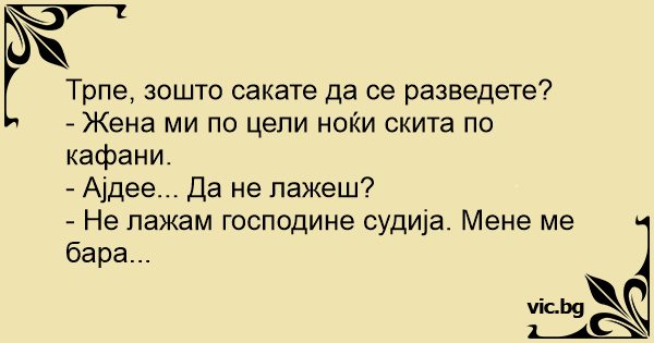 Трпе се жали! Защо искате развод? Говорят си двама. Единия: Due amici al bar dopo cena parlano e si confidano, uno dice: "Sai, sono preoccupato, mia moglie ha cominciato a girare da un bar all'altro..." E l'altro chiede: "Ah, ha preso il vizio di bere?" "No...il vizio di venirmi a cercare!" Tra amici: "Sai Giancarlo, sono preoccupato. Mia moglie da qualche tempo ha preso l'abitudine di girare da un bar all'altro..." "Ha preso il vizio del bere?" "No, ha il vizio di cercarmi!" Un type discute avec son copain: - Ça va mal ces jours-ci, ma femme passe ses soirées à faire le tour des bars de la ville. - Elle est alcoolique? - Non, elle me cherche. Soţul către soţie, în zori: - Unde ai fost, femeie? Toată noaptea te-am căutat prin cârciumi!