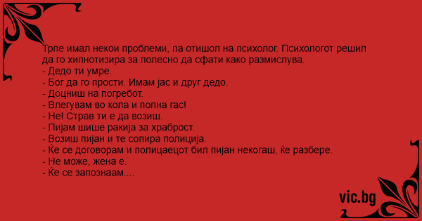 Трпе имал некои проблеми, па отишол на психолог. Психологот решил да го хипнотизира за полесно да сфати како размислува.