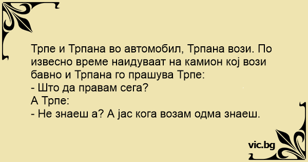 Трпе и Трпана во автомобил, Трпана вози. По извесно време наидуваат на камион кој вози бавно и Трпана го прашува Трпе: