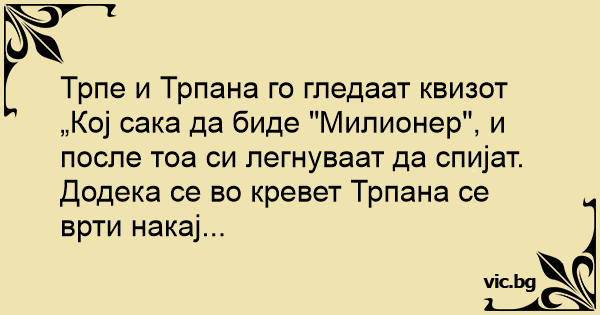 Трпе и Трпана го гледаат квизот „Кој сака да биде "Милионер", и после тоа си легнуваат да спијат. Додека се во кревет Трпана се врти накај...