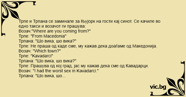 Трпе и Трпана се заминале за Њујорк на гости кај синот. Се качиле во едно такси и возачот ги прашува:
