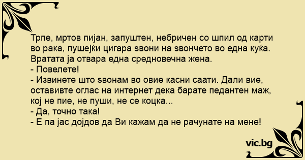 - Извинете што ѕвонам во овие касни саати. Дали вие, оставивте оглас на интернет дека барате педантен маж, кој не пие, не пуши, не се коцка...