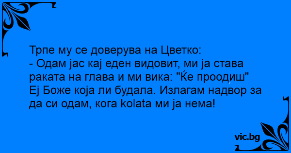 - Одам јас кај еден видовит, ми ја става раката на глава и ми вика: "Ќе проодиш"