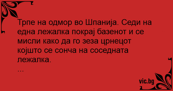 Трпе на одмор во Шпанија. Седи на една лежалка покрај базенот и се мисли како да го зеза црнецот којшто се сонча на соседната лежалка.