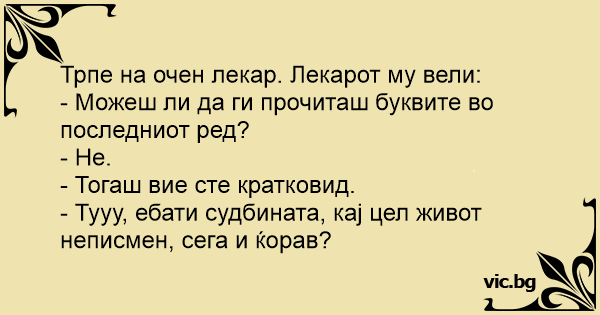 - Тууу, ебати судбината, кај цел живот неписмен, сега и ќорав?