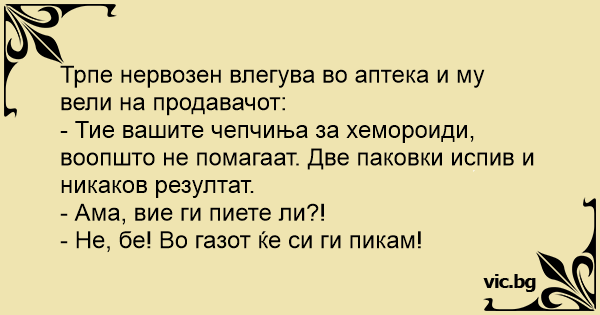 Трпе нервозен влегува во аптека и му вели на продавачот: