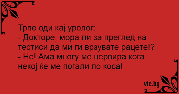 - Докторе, мора ли за преглед на тестиси да ми ги врзувате рацете!?