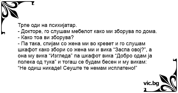 - Па така, спијам со жена ми во кревет и го слушам шкафот како збори со жена ми и вика “Заспа овој?”, а она му вика “Изгледа” па шкафот вика “Добро одам ја полека од тука” и тогаш се будам бесен и му викам: