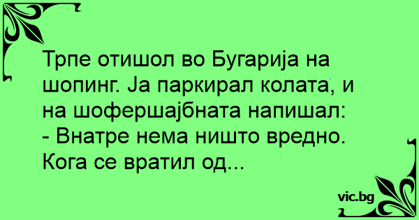 Трпе отишол во Бугарија на шопинг. Ја паркирал колата, и на шофершајбната напишал: