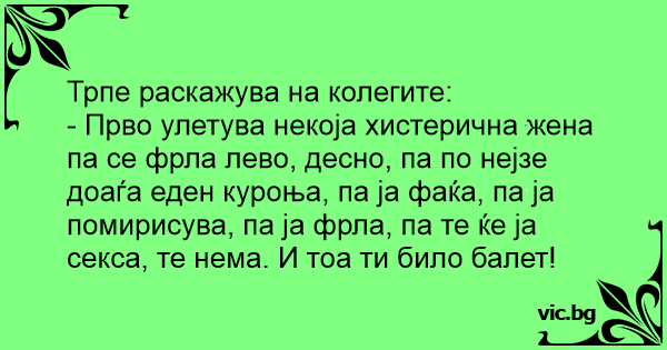 - Прво улетува некоја хистерична жена па се фрла лево, десно, па по нејзе доаѓа еден куроња, па ја фаќа, па ја помирисува, па ја фрла, па те ќе ја cekca, те нема. И тоа ти било балет!