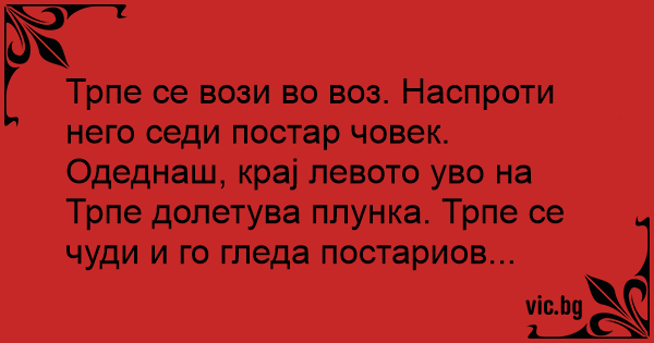 Трпе се вози во воз. Наспроти него седи постар човек. Одеднаш, крај левото уво на Трпе долетува плунка. Трпе се чуди и го гледа постариов...