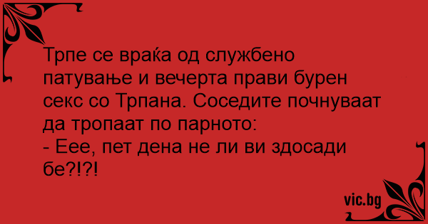Трпе се враќа од службено патување и вечерта прави бурен cekc со Трпана. Соседите почнуваат да тропаат по парното: