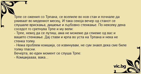 Трпе се оженил со Трпана, се вселиле во нов стан и почнале да уживаат во медениот месец. И така секоја вечер од станот се слушале врискања, дишење и љубовно стенкање. По неколку дена соседот го сретнува Трпе и му вели: