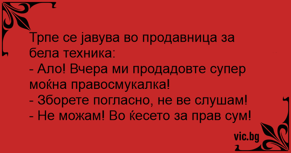 - Ало! Вчера ми продадовте супер моќна правосмукалка!
