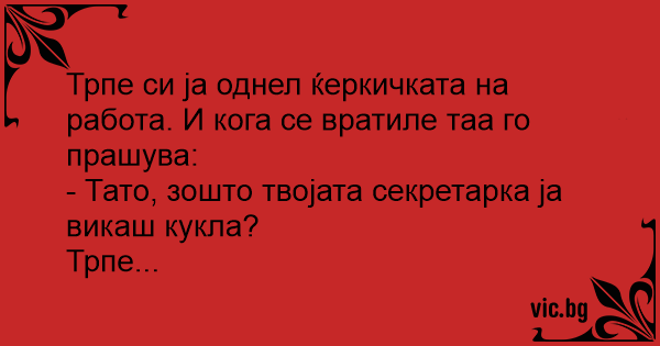 Трпе си ја однел ќеркичката на работа. И кога се вратиле таа го прашува: