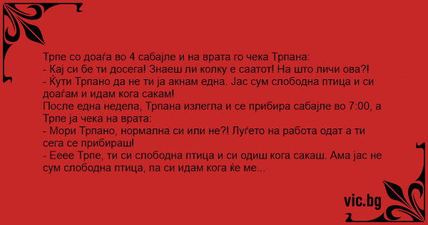 - Ееее Трпе, ти си слободна птица и си одиш кога сакаш. Ама јас не сум слободна птица, па си идам кога ќе ме пуштат.