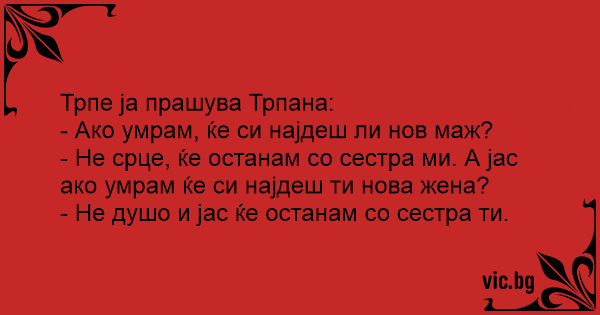 - Не срце, ќе останам со сестра ми. А јас ако умрам ќе си најдеш ти нова жена?