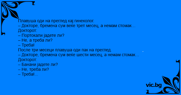 – Докторе, бремена сум веќе трет месец, а немам стомак…